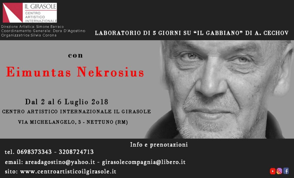 Il laboratorio a cura di Eimuntas Nekrošius si svolgerà in 5 giornate di lavoro, (da lunedì 02 a venerdì 06 Luglio 2018) ed intende aprire un campo di ricerca circa Il Gabbiano di A. Cechov.